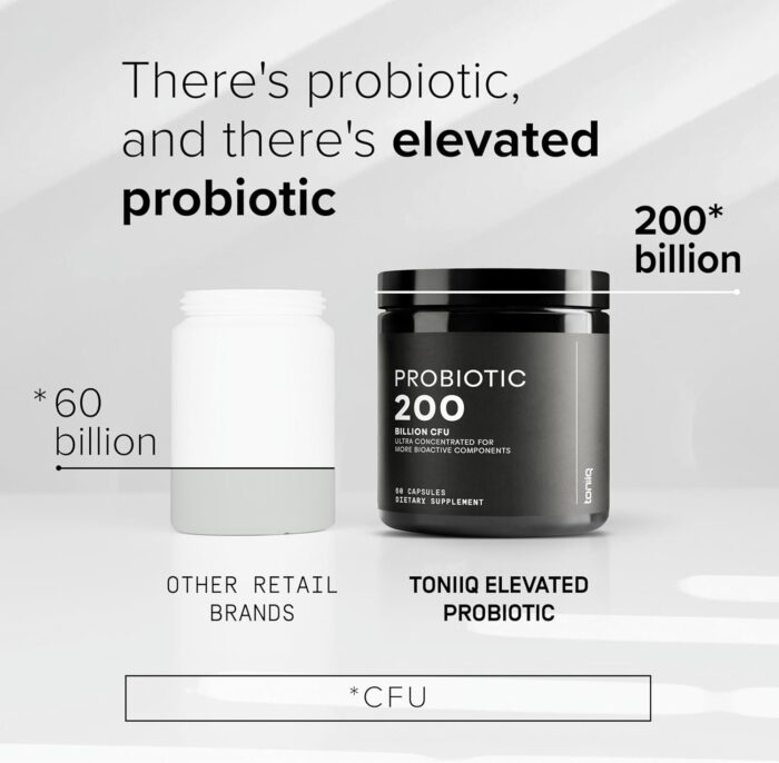 The Highest Verified CFU Count – At over 200 Billion CFU per serving with 30 clinically studied broad spectrum strains, Toniiq’s Probiotic 200 is setting a new standard for what is possible with probiotics.