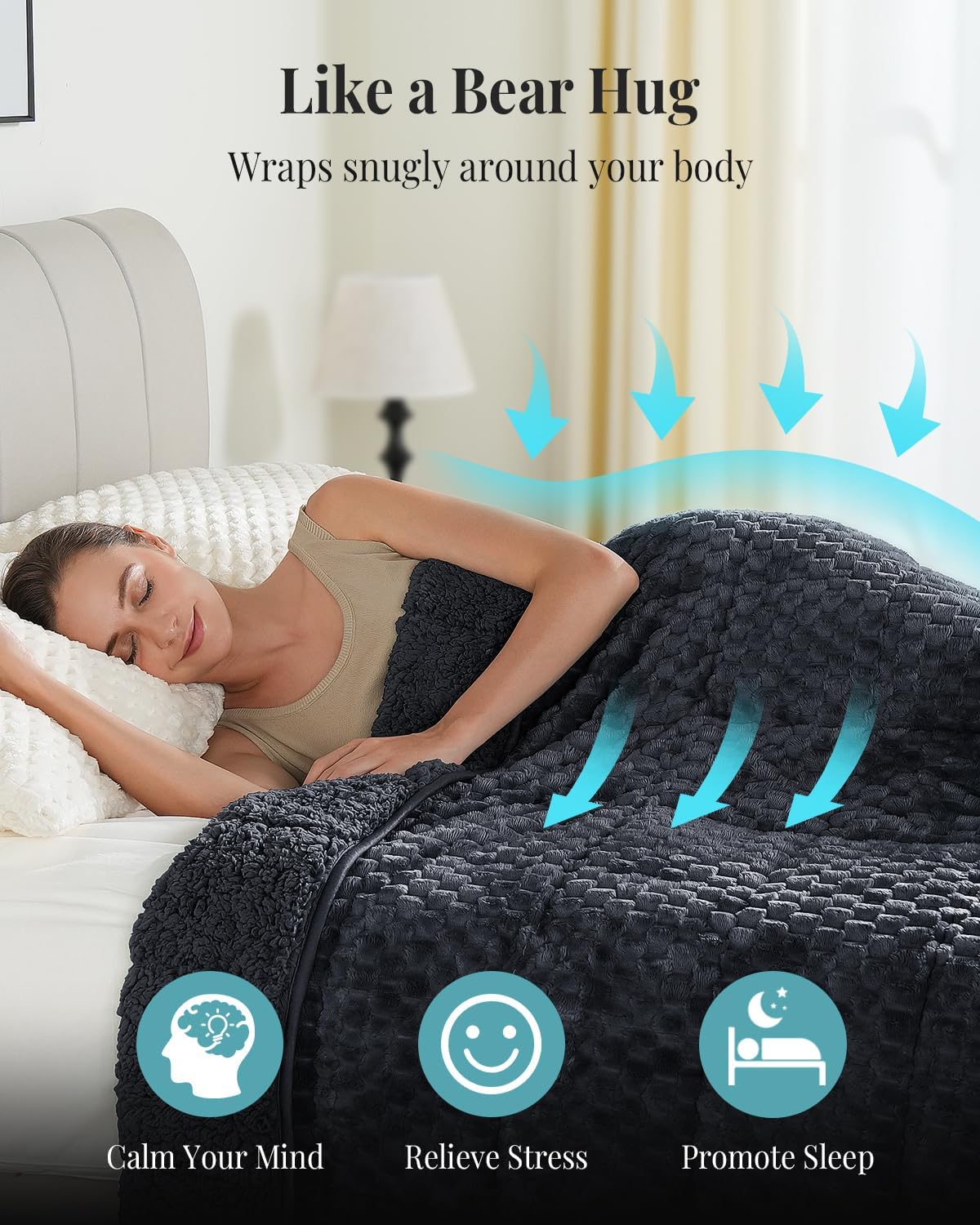 Relax and Sleep Well: This warm weighted blanket provides a comforting embrace, creating a sense of security that helps you relax faster, reduce stress, and improve sleep quality. It’s an ideal choice for those seeking a high-quality sleep experience.