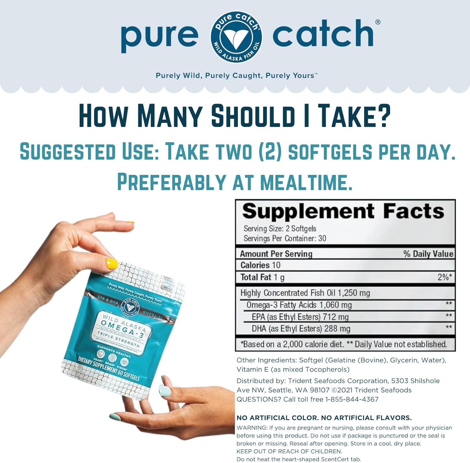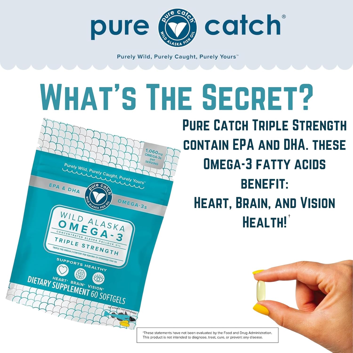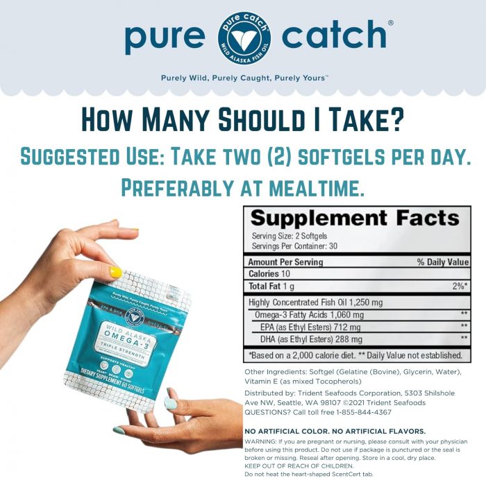 Purely Wild: Pure Catch is concentrated to deliver triple the amount of essential omega-3s found in wild Alaska pollock. Each serving provides 1,060 mg of omega 3 fatty acids, including 712 mg of EPA, and 288 mg of DHA.