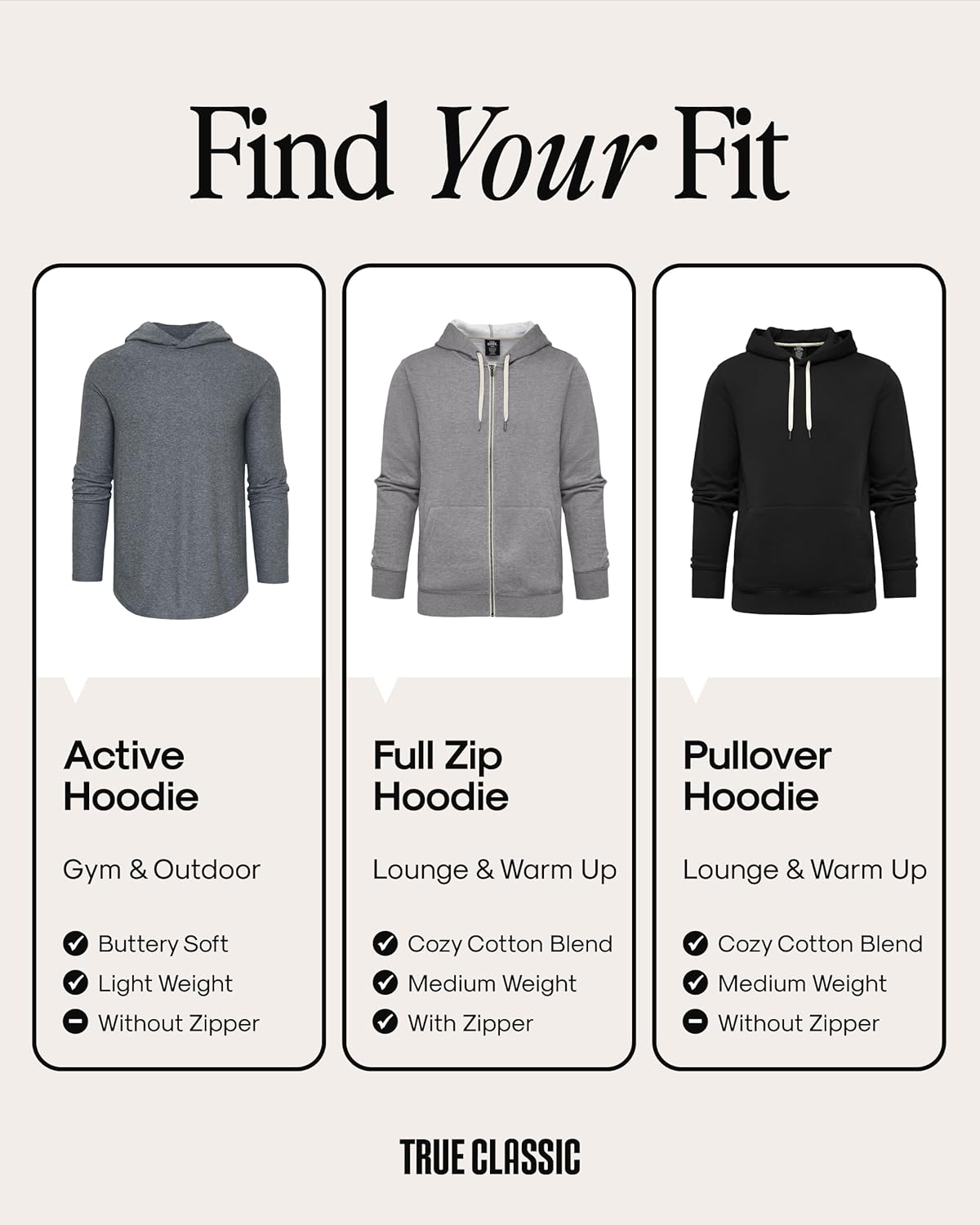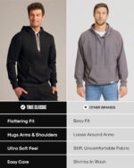 Built for comfort, made to move, and styled to fit—True Classic hoodies deliver the “fits perfect” feel customers call out. This collection of hoodies for men includes our performance Active Hoodie, a classic pullover hoodie, and a cozy zip-up sweatshirt. The Active Hoodie uses a smooth 96/4 performance blend that wicks moisture, dries fast, helps control odor, and adds UPF 30 sun protection (white rated UPF 15), so your hoodie stays comfortable during training, travel, or anytime you’re on the go. Prefer plush? Our French-terry pullover and zip-up mens hoodies are brushed inside and out for a soft, warm hand feel—easy to layer, easy to live in. Each hoodie features an athletic fit that’s true to size and designed to move with you without feeling baggy or tight. Clean details—tagless labels, side seams that hold shape, durable stitching, and functional pockets—make these men’s fashion hoodies & sweatshirts simple to style Monday through Sunday. Available in S–3XL and go-with-everything colors like plain black hoodie, navy/dark blue hoodie men need, carbon/charcoal heather grey hoodies men love, and military green mens hoodie (varies by style). Wash cold and dry low; expect minimal shrinkage so your favorite fit stays the favorite. Choose your True Classic hoodie, pull it on, and head out feeling comfortable, covered, and ready for whatever’s next.