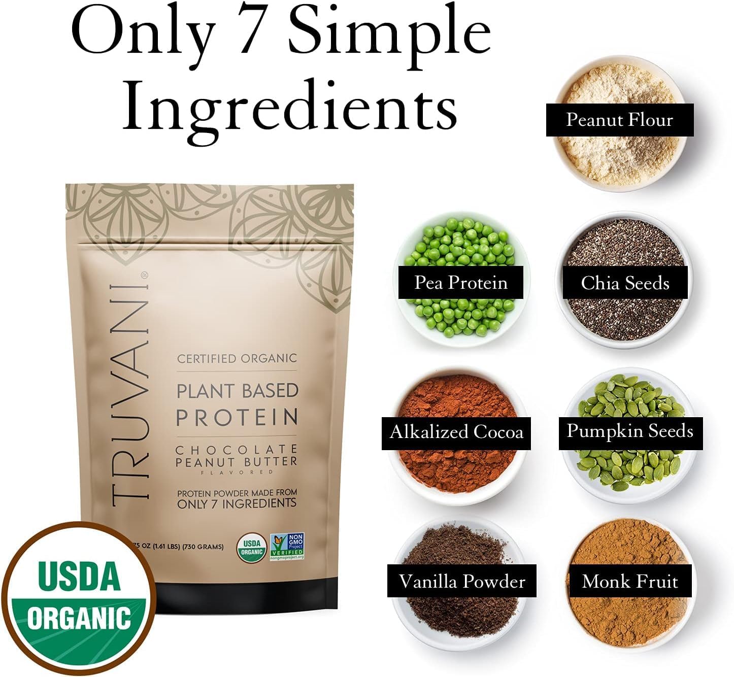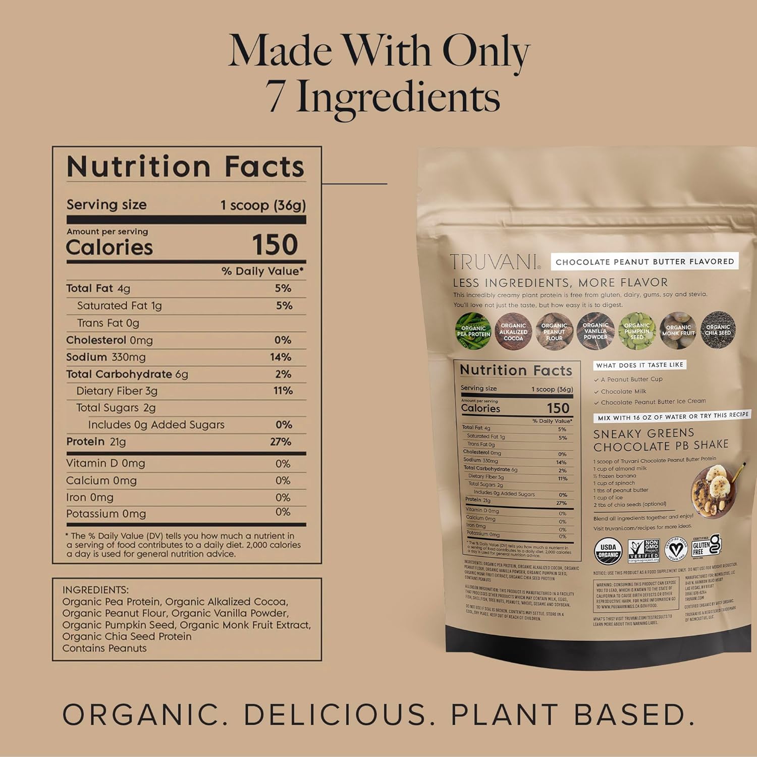 Organic Pea Protein, Organic Alkalized Cocoa, Organic Peanut Flour, Organic Vanilla Powder, Organic Pumpkin Seed, Organic Monk Fruit Extract, Organic Chia Seed Protein