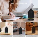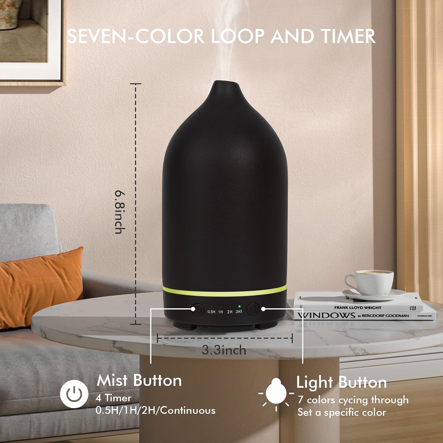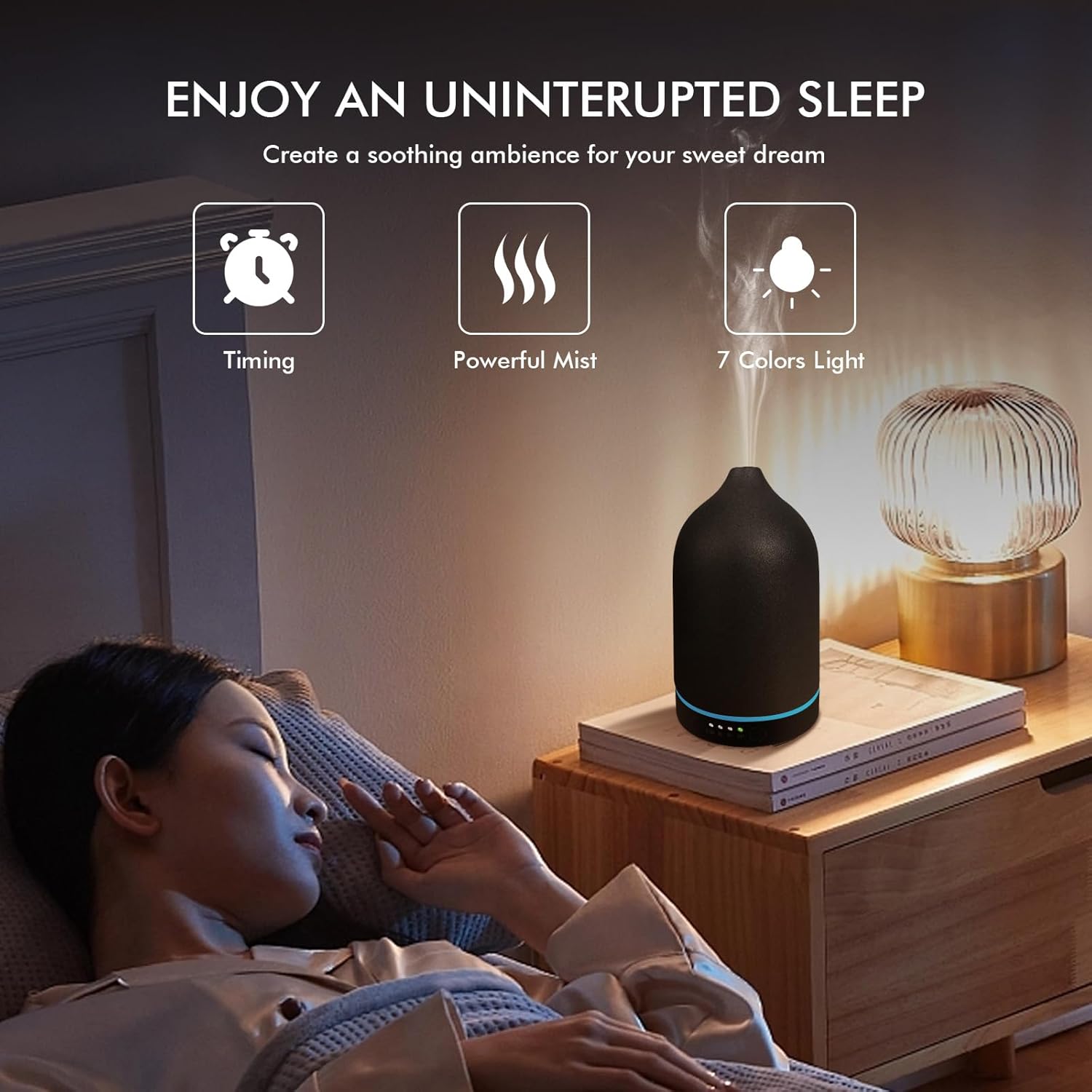 Multifunctional Aroma Diffuser: This aromatherapy diffuser has 7 soothing LED lights ring, you can cycle seven colors or fix on one color or use light or mist function independently when you are sleeping. Creating a relaxing, warm, loving, fragrance environment in your home.
