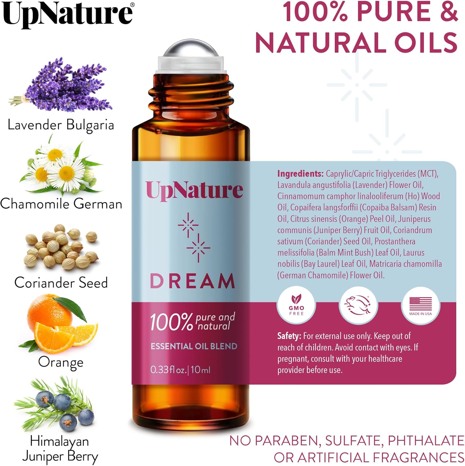 NATURAL SLEEPING BLEND: Our Dream Essential Oil Roll-On Blend combines the highest quality essential oils like Orange, Juniper Berry, Lavender, Coriander Seed, and Chamomile to support a restful sleep environment. Free from toxins and additives, it’s a 100% natural calming solution.
