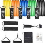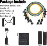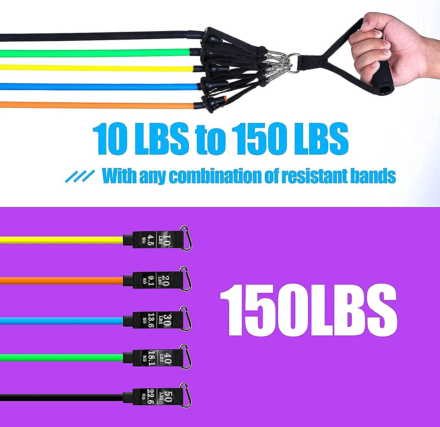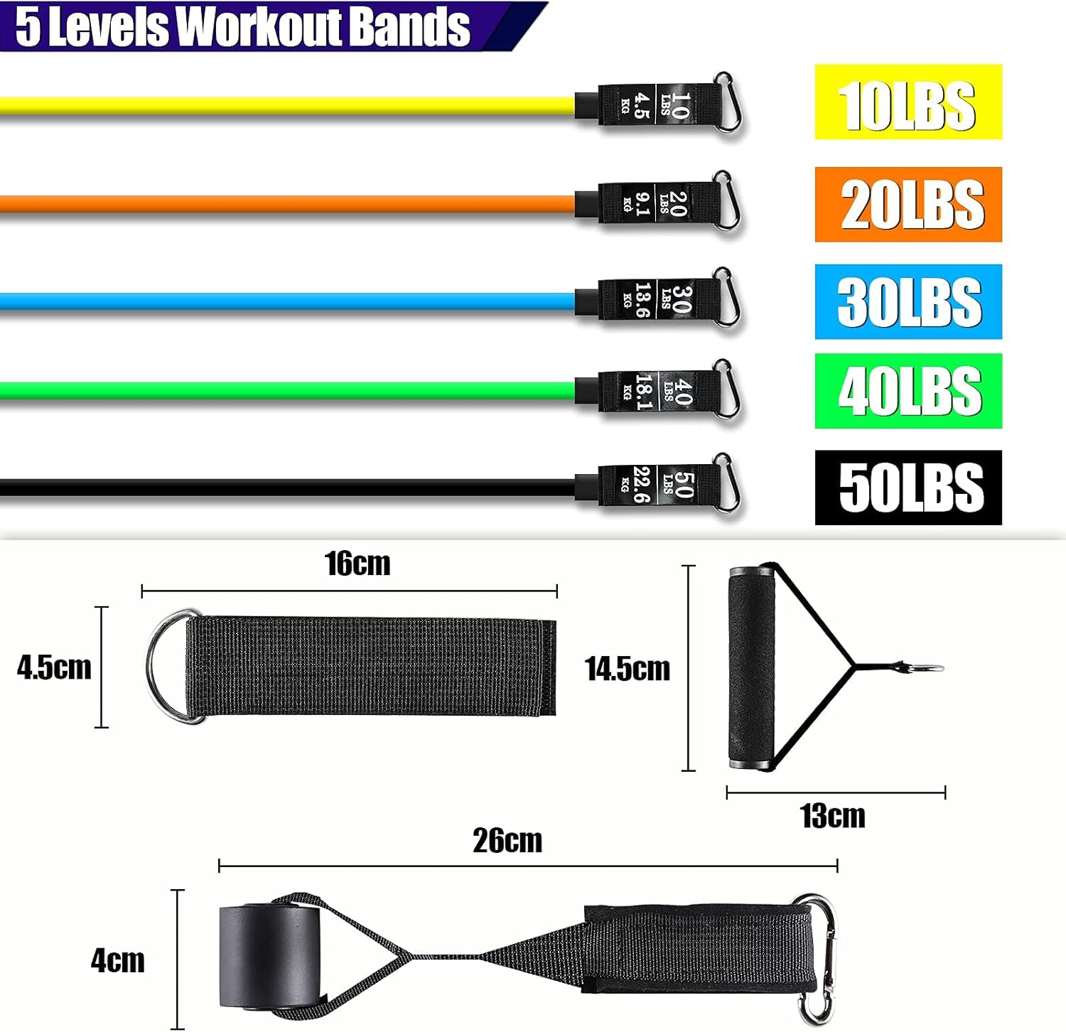 【12pcs In One Set】5pcs different resistance bands[ Black(50lbs) > Green(40lbs) > Blue(30lbs) >Orange (20lbs) > Yellow(10lbs)], 2pcs anti-slip handles, 2pcs ankle straps, 1pcs premium door anchor, 1pcs workout guide and 1pcs carry gift bag, you can have all in one set, easy to train, easy to carry for travelling.