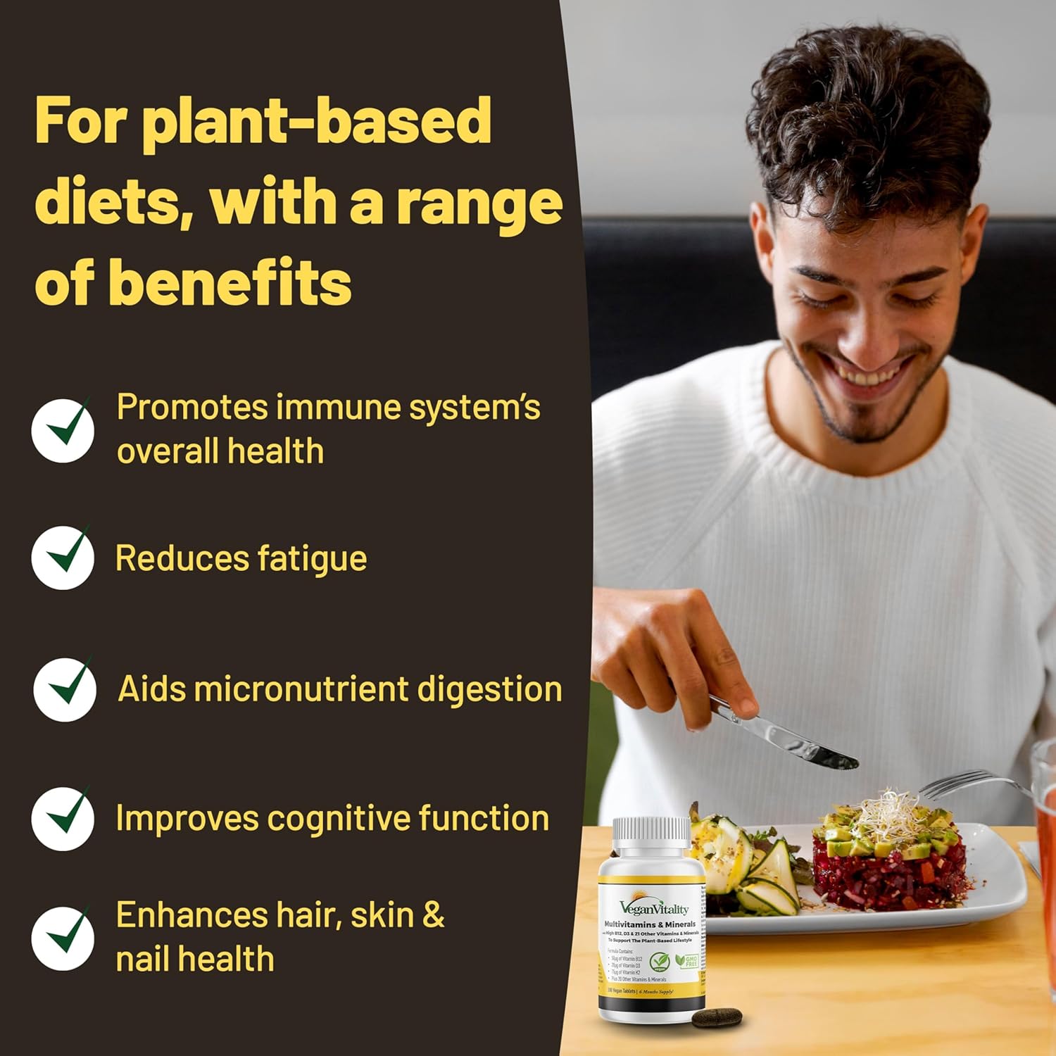 FREE FROM GLUTEN, sugar, wheat, nuts, soy, eggs, GMO substances. Multivitamin for vegans and vegetarians. Our vegan vitamins for women and men are also free from Cyanocobalamin, we only use Methylcobalam B12 source, most bio-available form of B12. Take this product with food.