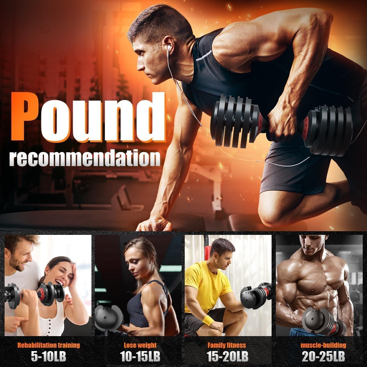 1 Second Weight Change: Turn the handle with single hand to quickly adjust to the required weight from 5 lb to 25 lb. There will be a corresponding pointer and a click sound to let you know that the adjustment is complete, which is super easy to use