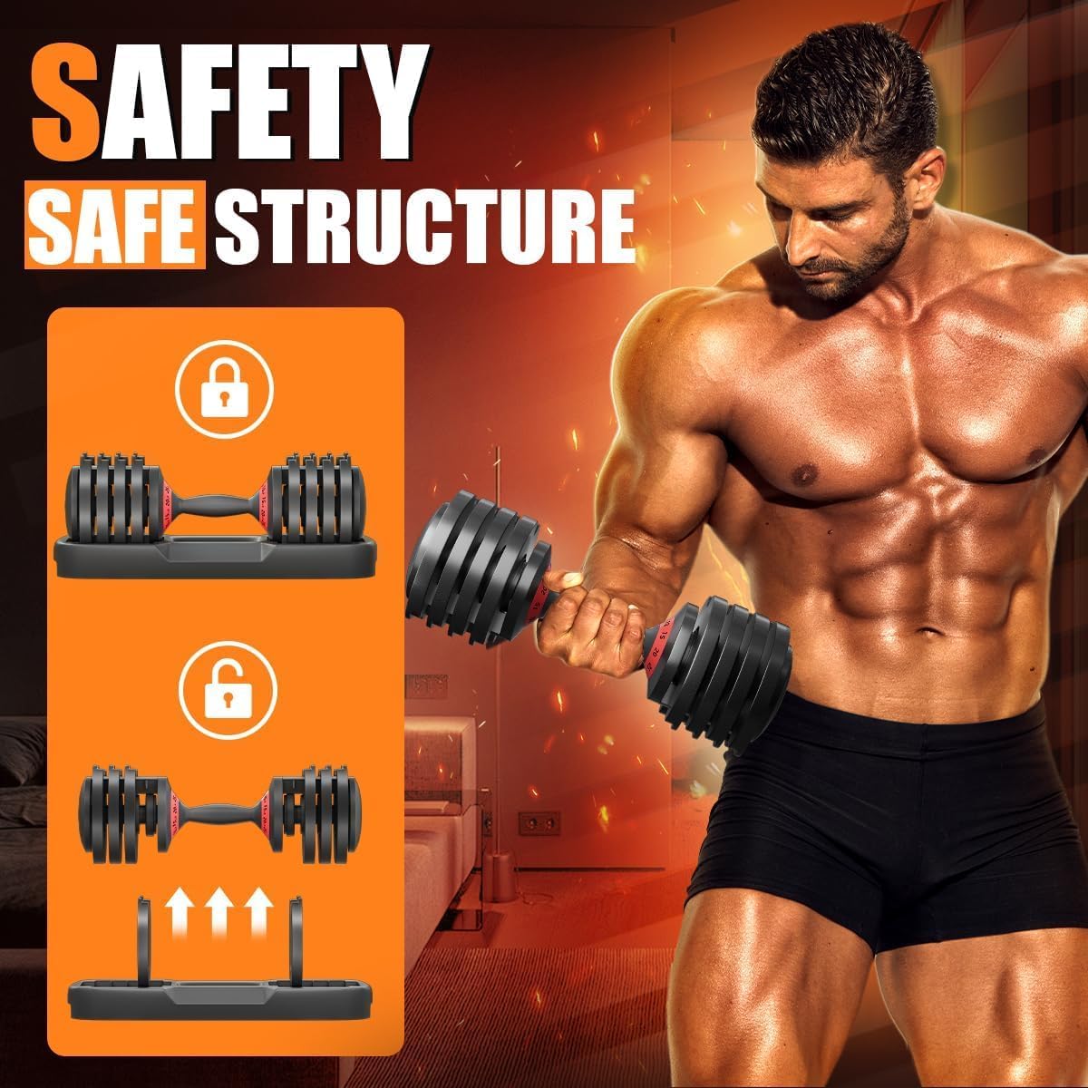Safety Structure: Double safety buckles on the tray and handle bar make this adjustable weight dumbbells pair can only be adjusted on the tray, the non-slip design at the handle ensures safety and stability during exercise after the dumbbell leave the tray