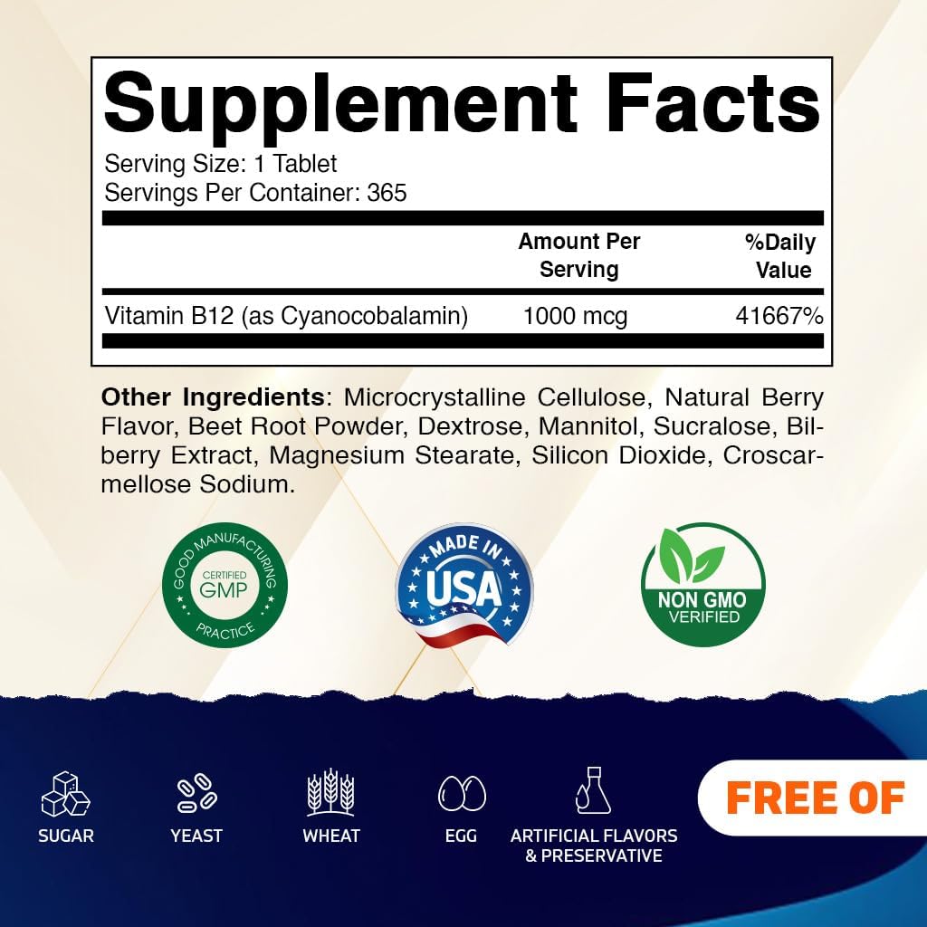 Customers find the vitamin B12 supplement to be good value, with positive feedback about its taste, being chewable and easy to swallow. The product performs as described, increases energy levels, and makes customers feel energetic throughout the day. While some customers report it dissolves quickly on the tongue, others mention it doesn’t dissolve well in the mouth.