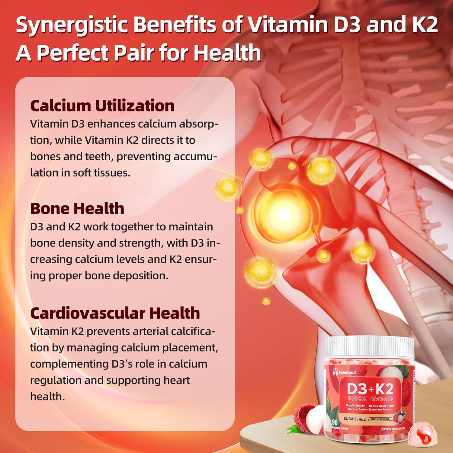 45 Days of Lychee-Flavored Wellness in Every Bottle! : Indulge in the unique taste of our lychee-flavored, center-filled gummies. Each D3 K2 vitamin gummy has a delightful, soft exterior with a burst of flavor in the middle. With 90 gummies per bottle, you get a 45-day supply when taking two gummies daily. This convenient dosage ensures you receive essential nutrients consistently, supporting bone health and overall wellness with every delightful bite