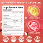 Energize and Support Overall Vitality!: Each serving of our d3 k2 vitamin 5000 IU gummies also includes 20mg of magnesium glycinate, a highly bioavailable form of magnesium. Magnesium plays a crucial role in muscle relaxation, nerve function, and maintaining a steady heart rhythm. Paired with D3 and K2, this powerful trio works together to support overall vitality, making it an ideal choice for those looking for vitamin D3 K2 gummies for adults