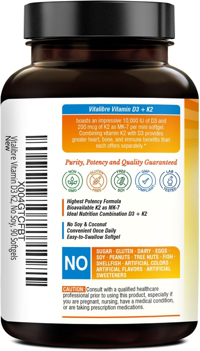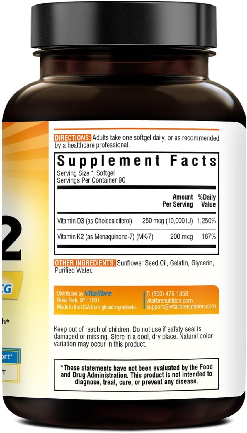 High Potency Vitamin D3 + K2: Each mini softgel delivers 10000 IU of the same bioactive vitamin D3 naturally produced in your body from direct sunlight and 200mcg of Vitamin K2 (as MK-7, the form of K2 with the highest bioavailability). Enjoy sunshine replenishment with Vitalibre Max Strength Vitamin D3 K2 no matter what the weather is like!*