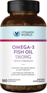 TRIPLE STRENGTH FISH OIL: Vitamin World Omega-3 fish oil contains 1360 mg fish oil with 950 mg omega-3 fatty acids, including 625 mg EPA, 244 mg DHA, and other beneficial fatty acids. With this high concentration, you only need to take one softgel daily