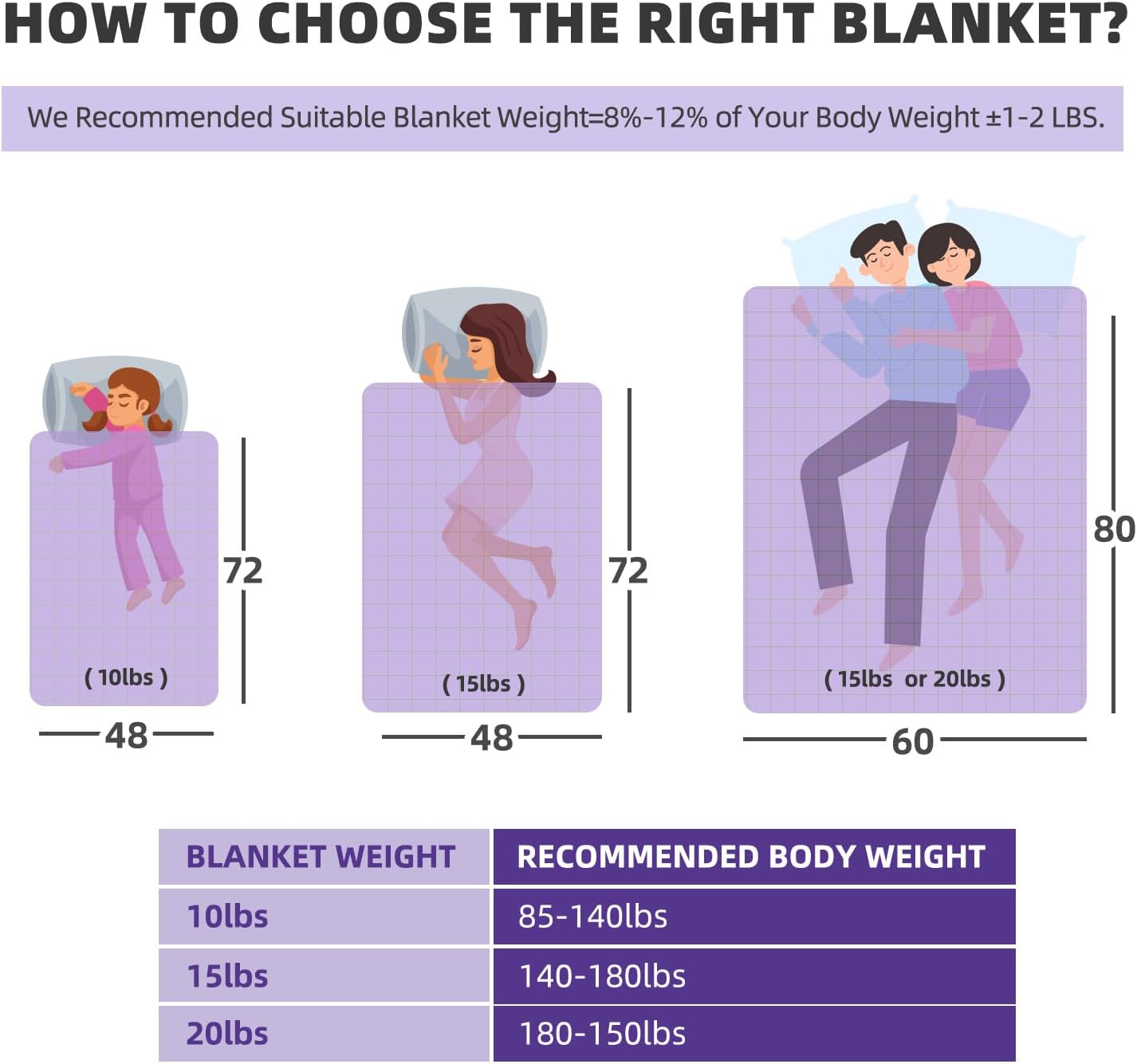 Weight and Size Recommendations:There are more people that choose 10% of body weight for ideal blanket weight. It will makes people feel safe, relaxed and more comfortable. We recommend 48”x72”10lbs for kids, and 60”x80”20lbs for twin bed more suitable for adults. You can choose your needs according to the size chart.