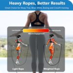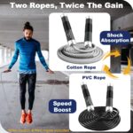 Upgraded tangle-free double ball bearings ensure a fast, smooth, and worry-free jump rope experience, eliminating tangles for uninterrupted workouts. The gold combination of 9mm braided cotton rope + 9mm solid PVC rope not only extends your jump rope’s lifespan by 2X but also allows seamless switching between cotton and PVC ropes, adding versatility to your rope skipping sessions. Featuring lightweight aluminum handles with raised silicone oval grips, this weighted jump rope enhances durability, comfort, and grip stability, preventing slips during intense training. Perfect for Double Unders, WOD, MMA, Boxing, and CrossFit, it’s the ultimate choice for high-performance jump rope workouts