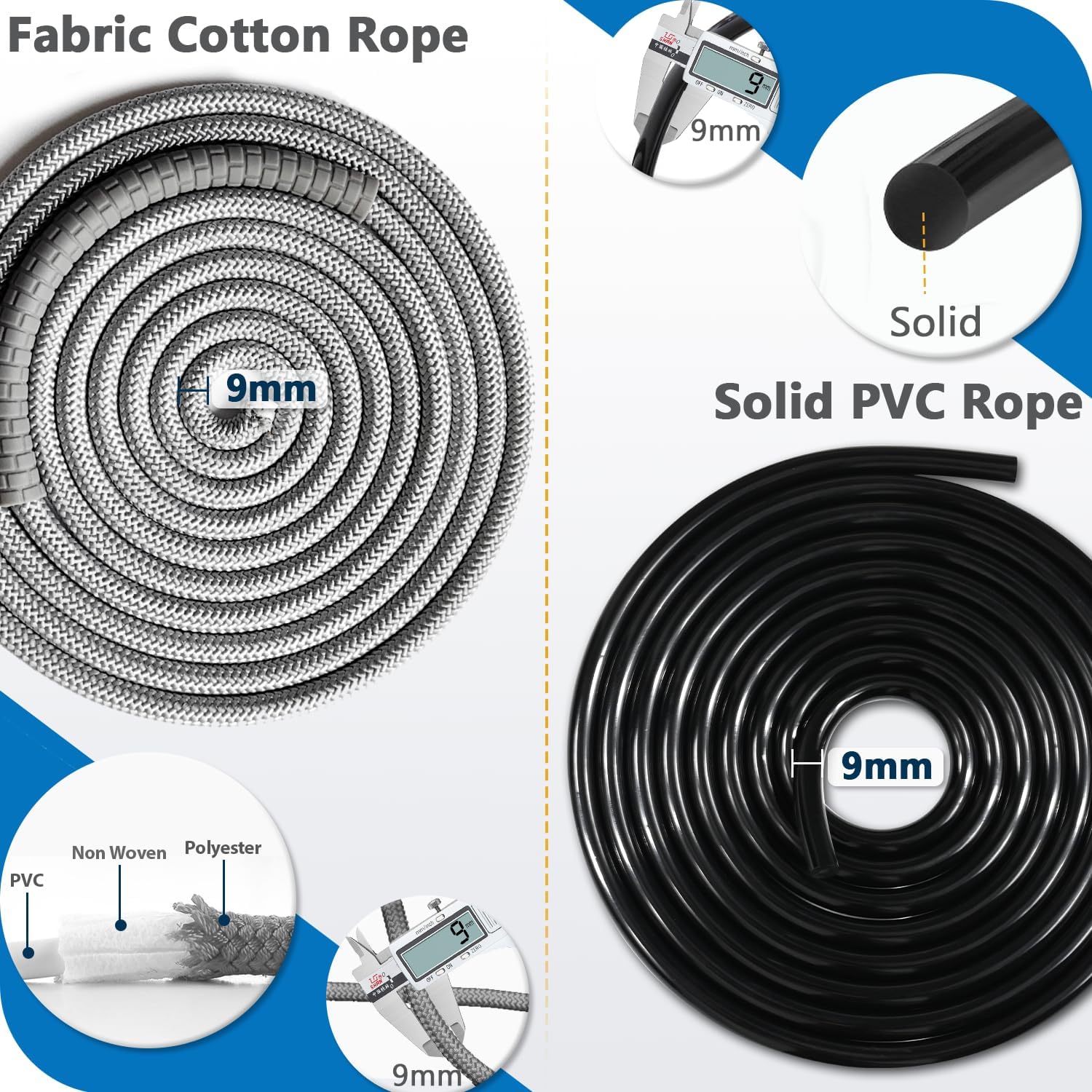 【2 Durable & Adjustable Ropes Combination】Skipping rope featuring a premium combination of a 9mm Thickened Cotton Rope(10ft) and a 9mm Solid PVC Rope(10ft), allowing you to easily switch between different training ropes to achieve various training goals. Suitable for a wider range of surfaces, it adds variety and excitement to your daily jump rope routine, remaining durable even after extended workouts