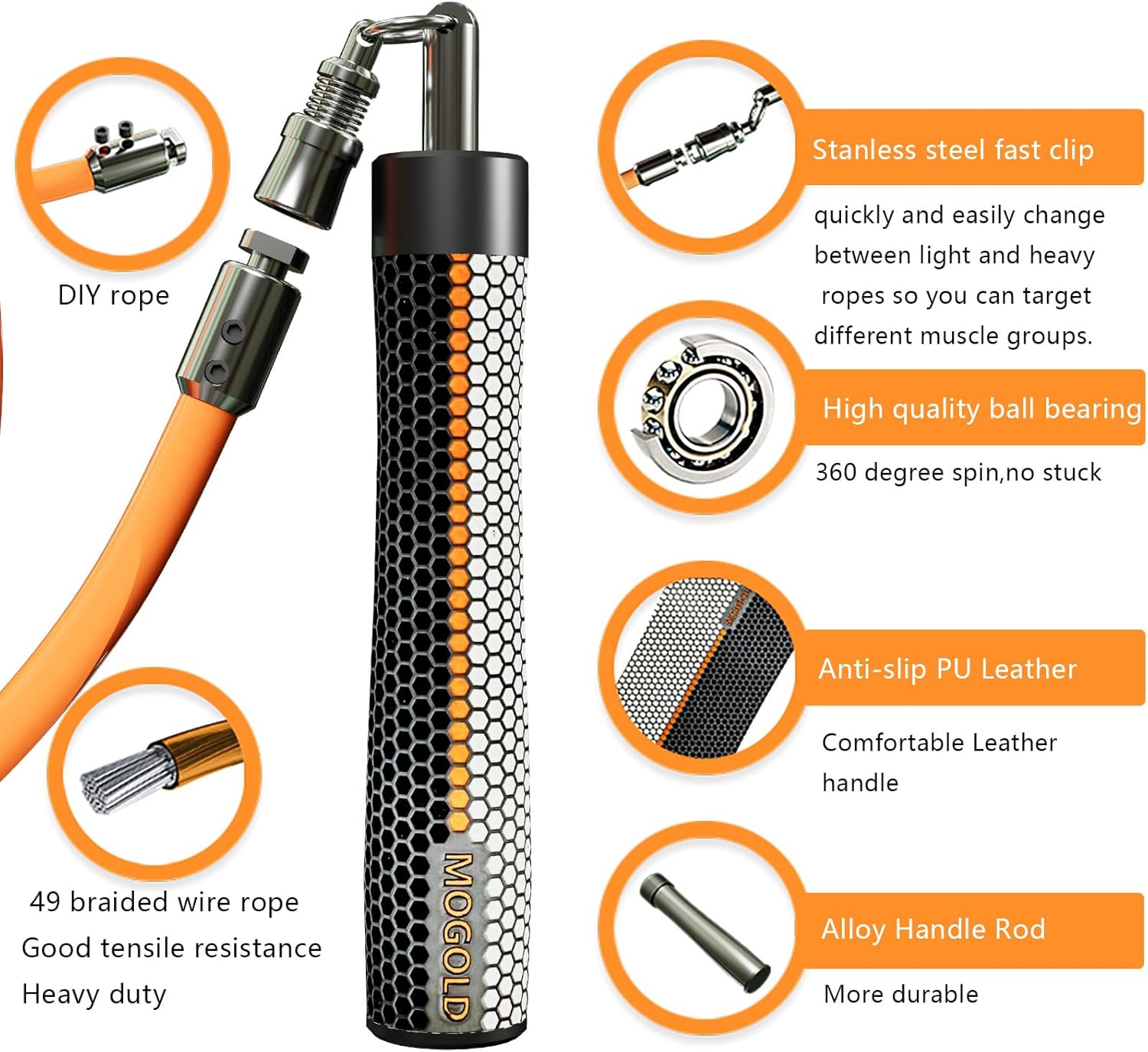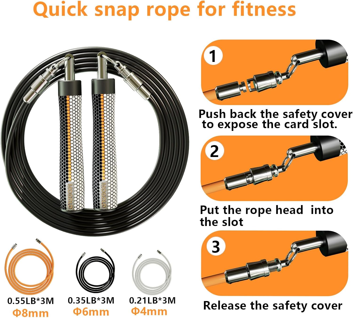 Durable & Tangle Free Jump Rope. 4MM,6MM(1/4 pound), and 8MM(1/2 pound)PVC coated steel wires that is finished to be durable and resistant. Moreover, prolong your ropes life and are far better than the regular steel ropes, Which allow you to jump on any surface without the ropes coiling or tangling.