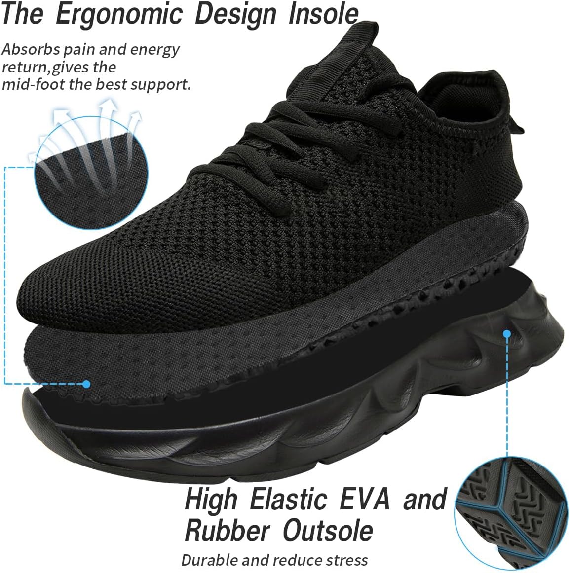 High elasticity EVA material and anti slip groove outsole, rebound shock absorption, with anti slip and ankle protection.