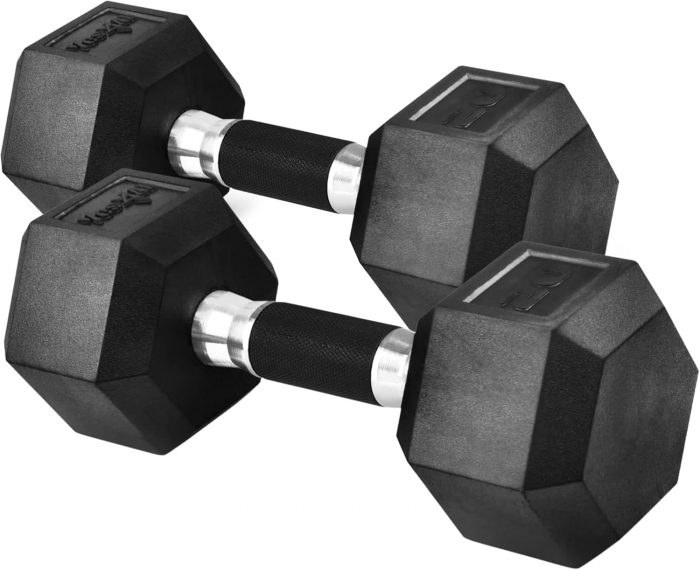 Yes4All rubber-grip dumbbells are designed for versatility as well as durability thanks to the fully coated rubber head and handle. Our dumbbells are available in weights ranging from 5lbs to 50lbs. This standard rubber hex design is a great, budget-priced option that still delivers on quality, performance, and longevity. The heavy-duty, rubber-encased heads minimize noise and limit wear and tear (to both the bells and your flooring), while the chrome-plated handle is ergonomically designed for a firm but comfortable feel in any grip style.